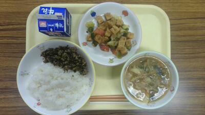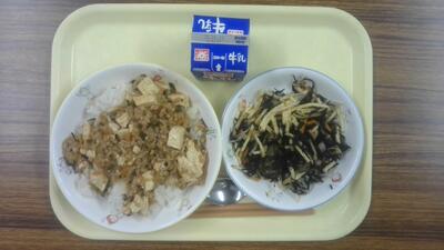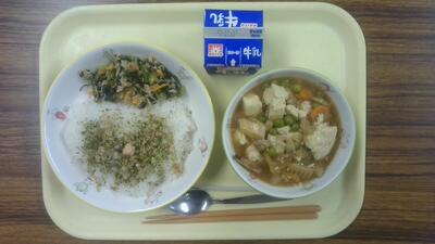 麻婆豆腐丼(麦入りごはん)、わかめスープ、いもゴマ団子、牛乳でした。