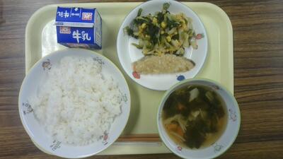 塩ラーメン(袋入り麺)、揚げ餃子、ツナの中華和え、牛乳でした。
