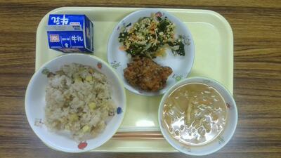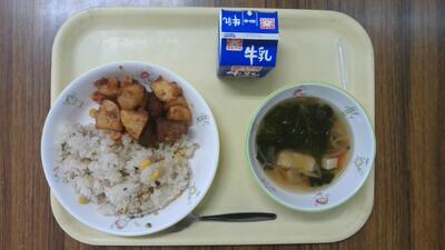 五目チャーハン、レバーとジャガイモのケチャップ和え、きくらげと豆腐のスープ、牛乳でした。