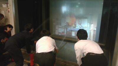 現地では、地震の映像資料の視聴、風水害の体験、119番通報の体験、消火器を使った消火体験、煙避難体験などを行いました。