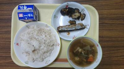 麦入りご飯、秋刀魚の松前煮、揚げナス、きのこのけんちん汁、牛乳でした。