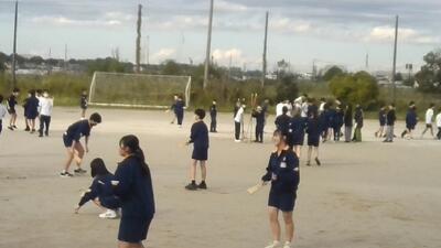 校庭には周回コースが作られ、2人1組のペアとなった生徒たちが前半後半に分かれ、12分間を目安に各自のペースで走ります。