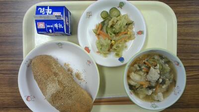 黒糖きなこ揚げパン、ふわふわ肉団子スープ、ごまだれサラダ、牛乳でした。