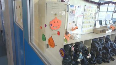 そのカボチャが生徒たちの手によって見事なランタンに生まれ変わり、2階の廊下に展示されました。