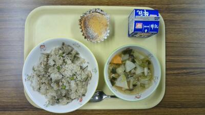 鶏ごぼうピラフ、かぶと白菜のスープ、カボチャのベイクドチーズケーキ、牛乳でした。