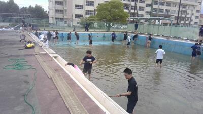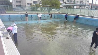 放課後、職員が続々と集まり、プールの底や壁についた汚れをブラシやたわしで磨いていきます。