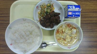 ごはん、とり肉のレモン揚げ、磯煮、イワシのつみれ汁、牛乳でした。