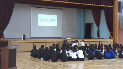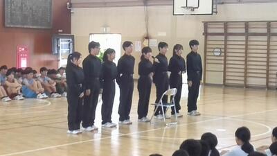 その後、コンピューター部が作成した「後輩からのメッセージ動画」が放映され、体育館が温かい雰囲気に包まれました。