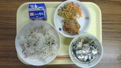 わかめご飯、鶏肉のから揚げ、吹き流しサラダ、お祝いすまし汁、牛乳でした。