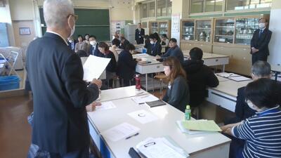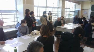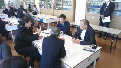 3校の教員が集まっているのが「ブロック定例研」の要素、3校の協議会委員が集まっているのが「合同学校運営協議会」の要素、地域学校協働活動推進員さんたちが飲み物を用意されているのが「ティーチャーズカフェ」の要素が入っています。3つの取組を一気に合わせて開催しようというのが今回の試みです。