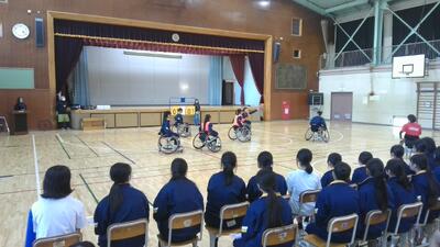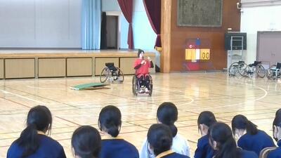 講師として、パラリンピック東京大会に出場した車いすバスケットボールプレイヤーの「小田島 理恵」さんをお招きし「御自身の半生についての講話」と「車いすバスケットボール体験」が行われました。