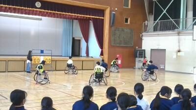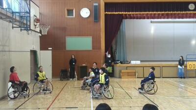 その後の「車いすバスケットボール体験」では、選出された生徒たちが3対3に分かれてゲームを行いました。