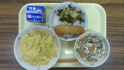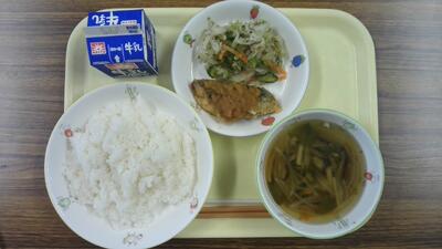 ごはん、サバのみぞれ揚げ、キャベツのゆかり和え、沢煮椀、牛乳でした。