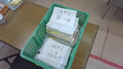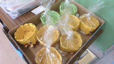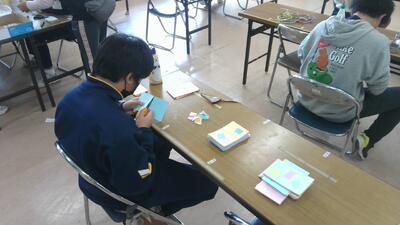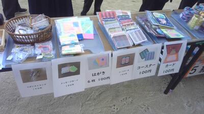 これは、5組の生徒たちが学習活動の中で作成した様々な作品を、格安の値段で生徒・保護者・地域の方に販売するというもので、販売品は紙バンド製の「ペン立て」「コースター」「かご」、ビーズ製の「ストラップ」、リボン製の「名札ストラップ」、手作りの「ミニ雑巾」「紙漉きはがき」「メッセージカード」「バースデーカード(封筒付)」などいろいろあります。