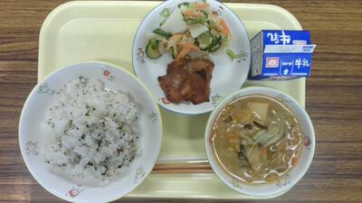 わかめごはん(麦入り)、鶏肉の照り焼き、ツナとカブのサラダ、キムチ味噌汁、牛乳でした。