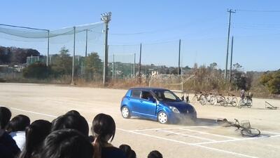 自転車乗車時に起こりうる様々な交通事故例が紹介されましたが、スタントマンによる交通事故の実演は迫力があり、生徒たちの視線も釘付けでした。