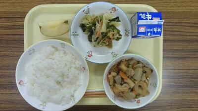 ごはん、イカと里芋のうま煮、もやし入り五色和え、りんご、牛乳でした。