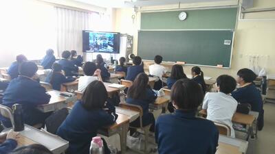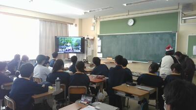 まずは学校行事等の際に撮りためた写真のスライドショーが流れました。生徒たちは、次々と流れる映像に見入ったり、懐かしんだりしていました。