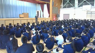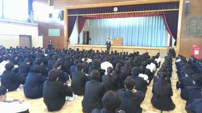 始業集会では、校長講話や生徒指導主事の話のほか、進路指導主事から3年生の現在の状況や毎日の中で心掛けてほしいことについて話がありました。