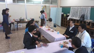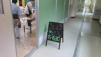 会場には、入れたてのコーヒーをはじめ多くの種類の飲み物(アルコール類はありません、悪しからず)やお菓子が用意されており、参加した人たちはそれぞれ好きな話題で雑談をしたり、学校や地域のことについて情報交換をしたり、仕事が一段落した教員が立ち寄って、ほっと一息つく場面も見られたりしました。