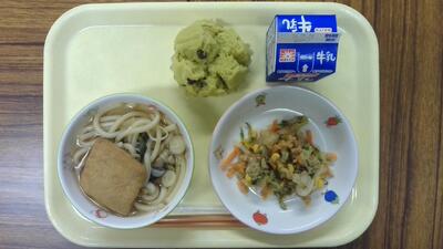 山菜うどん、キツネ餅揚げ、ツナと茎わかめのサラダ、抹茶小豆蒸しパン、牛乳でした。
