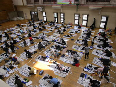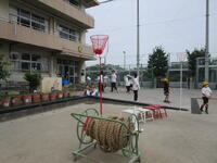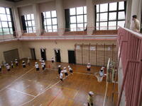 体育館では一年生が昔遊びの学習をしていました。こま回しの練習です。