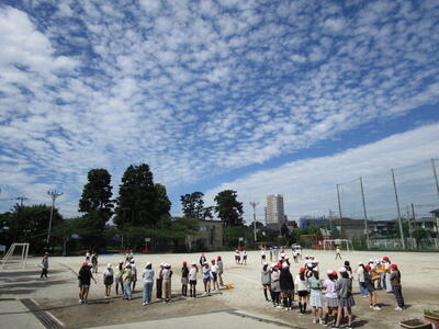 美しいうろこ雲の下、ソフトボール投げを行っています。