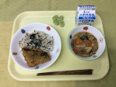 献立:ごはん 行徳産海苔の佃煮 千葉県産ハーブ鶏の竜田揚げ 小松菜のおひたし 千産千消豚汁