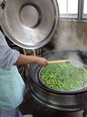 たまに調理師さんがざるでそら豆を動かしますと1年生に伝えると
