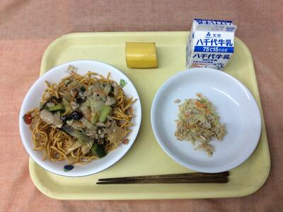 献立:牛乳 あんかけ焼きそば 棒棒鶏 白玉小豆