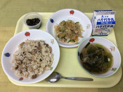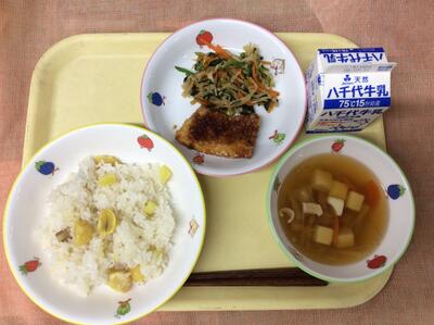 献立:牛乳 里芋ごはん 鱈の幽庵焼き 胡麻白和え 湯葉の澄まし汁
