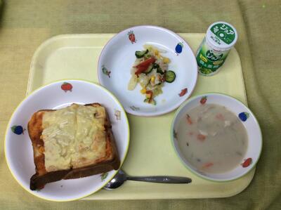 献立:牛乳 ピザトースト シーザーサラダ 白菜の豆乳クリームスープ みかん