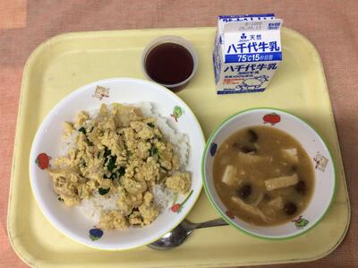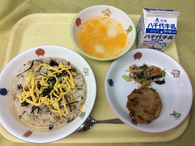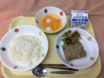献立:牛乳 ごはん 卵焼き ひじきと大豆の磯煮 生揚げのそぼろ煮