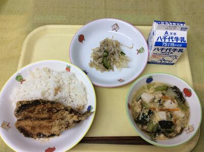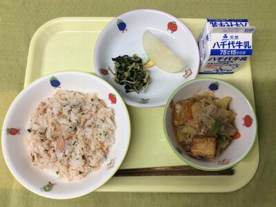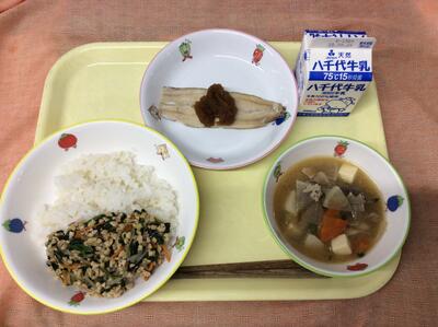 献立:牛乳 ごはん 鯖の生姜煮 切干大根の含め煮 蕪のそぼろ煮