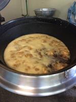 具材が沈んだり茶碗蒸しのような食感にならないように半分の量は半熟にして、残りの卵液と合わせてから鉄板に流して焼き上げます。