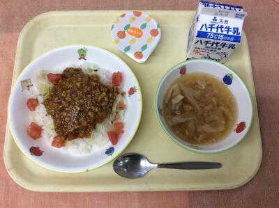献立:牛乳 ガパオライス わかめスープ 牛乳寒天