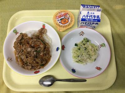 献立:牛乳 豚肉の柳川風丼 茎わかめの金平サラダ 大学芋