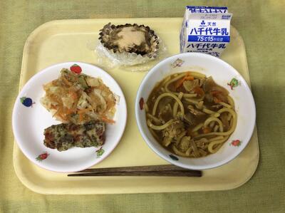献立:牛乳 カレーうどん 蓮根サラダ さつまいもと林檎の春巻き