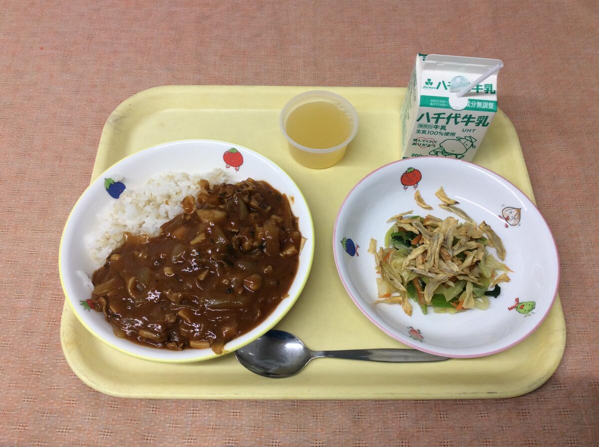 献立:牛乳 ポークカレーライス パリパリひじきサラダ ヨーグルト