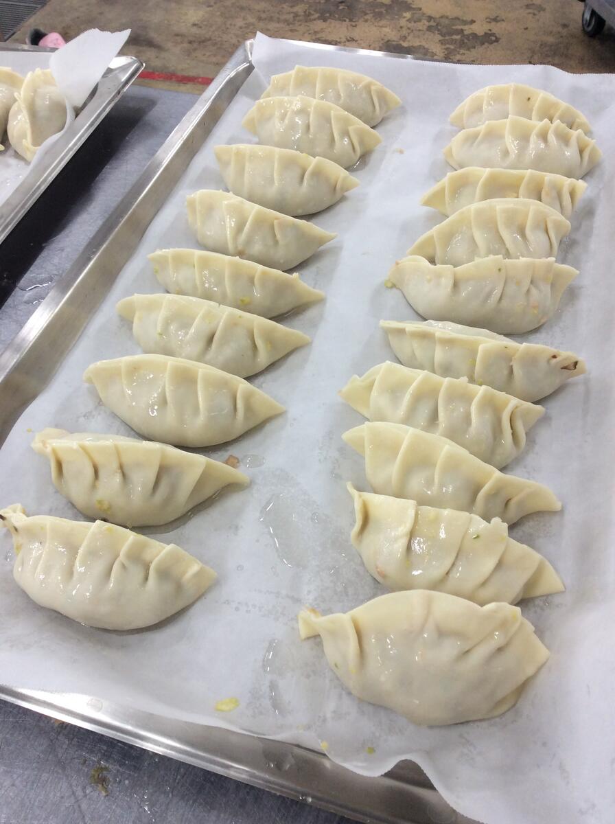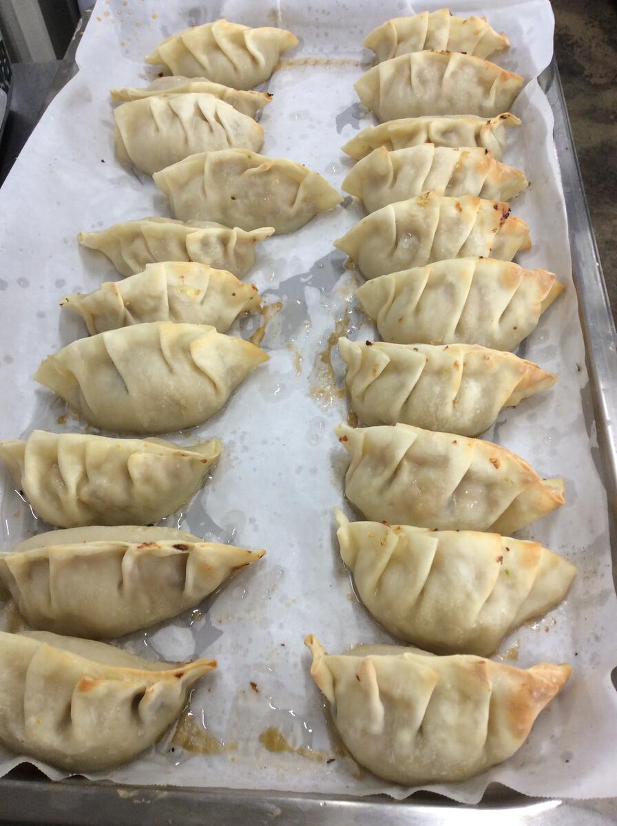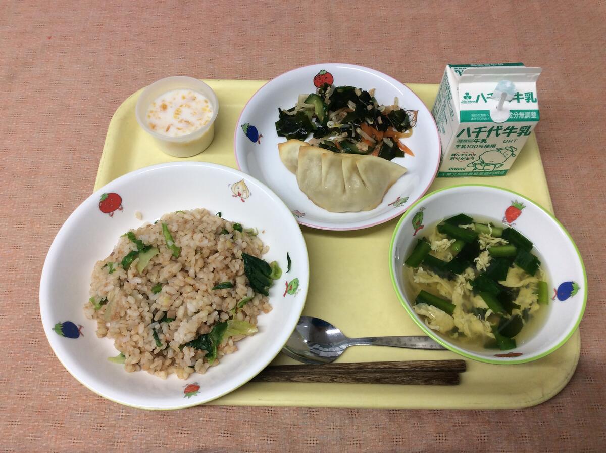 献立:牛乳 鮭とレタスのチャーハン 野菜たっぷり餃子 春雨とニラとわかめの卵スープ ぽんかん入り杏仁豆腐