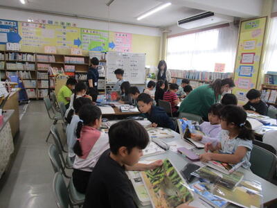 図書室では図書館ボランティアの方と学校司書の先生が、3年生の図鑑の使い方の授業をお手伝いしてくれていまし