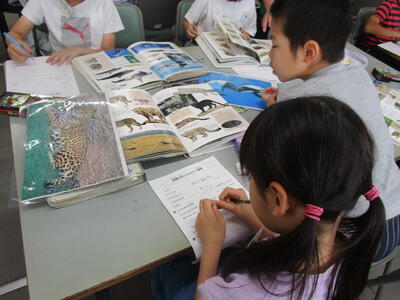 クイズに出された生き物を図鑑で調べて記録していきます。夢中になって調べていました。