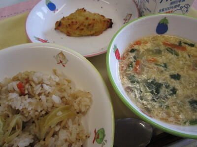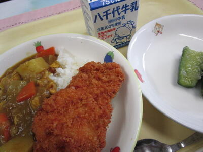 献立:牛乳 ごはん 揚げ鶏 グリル野菜(南瓜・蓮根) スープカレー ヨーグルト