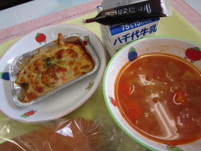 献立:牛乳 黒糖パン 夏野菜のキッシュ キャベツともやしのカレー炒め ミネストローネ