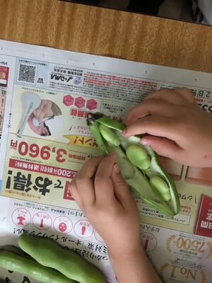 給食の時間では空豆特有の味や香りに苦戦している子もいましたが、よく食べていました。
