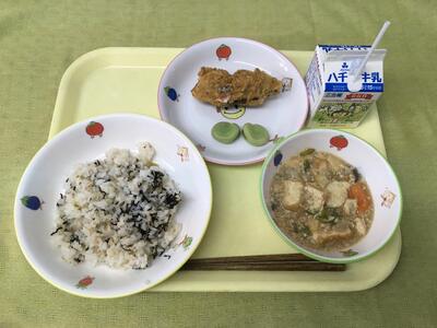 ・牛乳・海苔菜飯・鯖のごま揚げ・生揚げのそぼろ煮・そらまめ