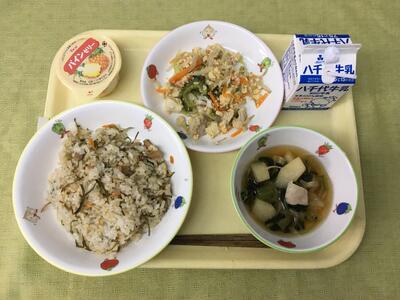 ゴーヤは調理員さんがとても薄く切ってくれたのであまり苦みもなく、児童もよく食べていました。