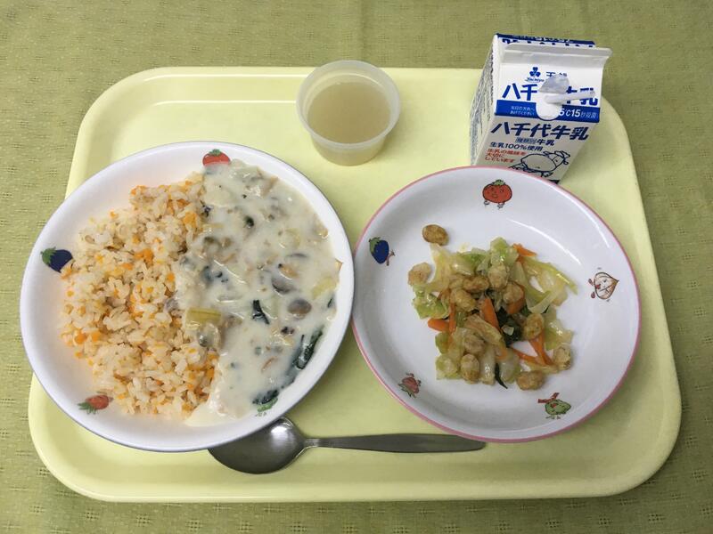 献立:牛乳 にんじんピラフ アサリのクリームソース カリカリ大豆サラダ 手作り梨ゼリー
