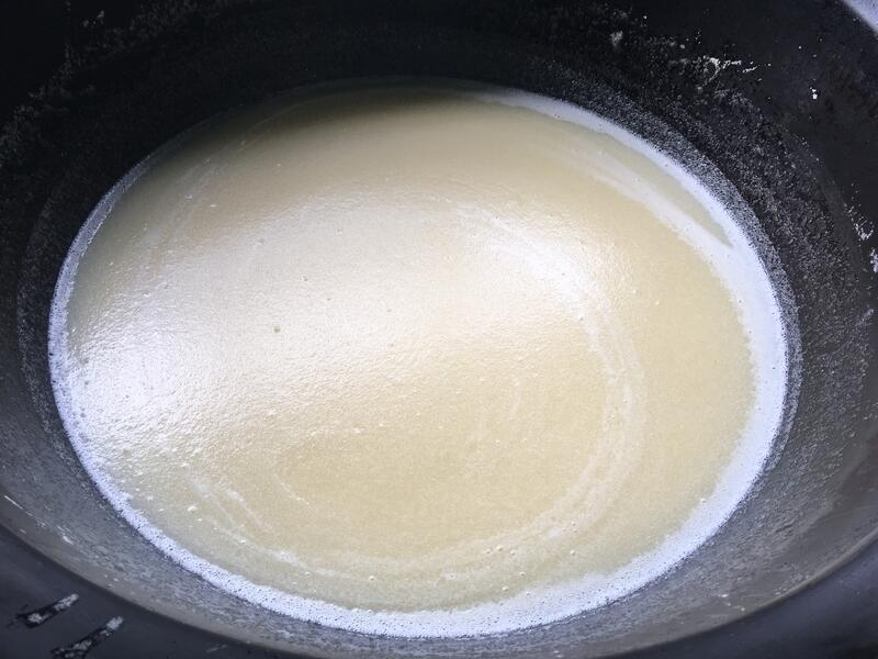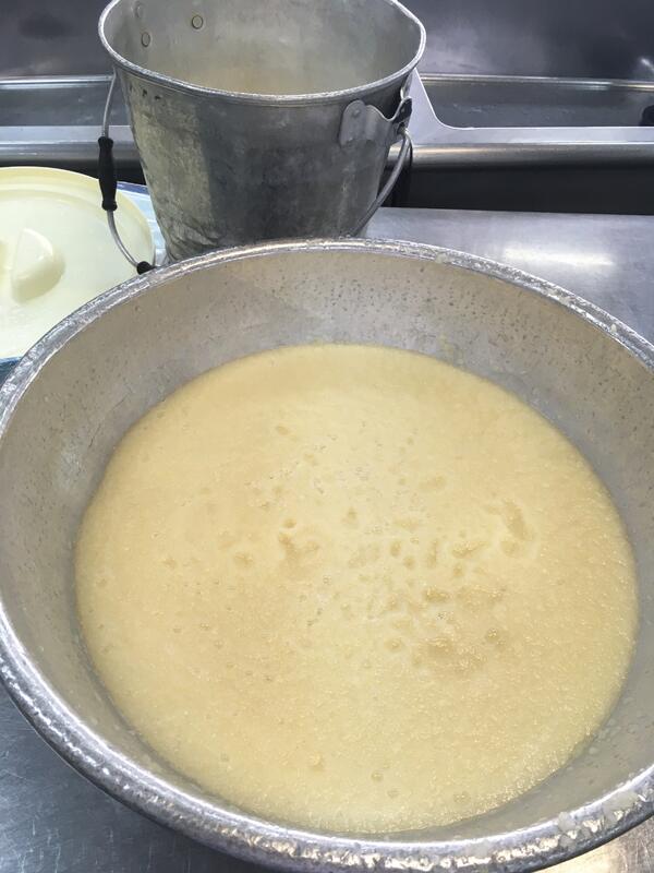 アガーというゼリーの素と一緒に85℃以上まで加熱します。焦げ付かないように、混ぜているうちに鉄釜と反応して、少し色が変わります。