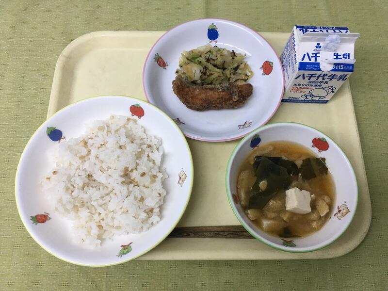 献立:牛乳 ごはん スズキの竜田揚げ キャベツの塩昆布和え 豆腐とわかめの味噌汁